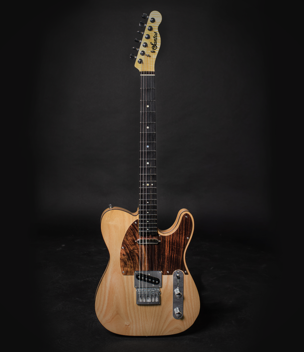 Una versión de las guitarras tipo Telecaster, con grandes mejoras a nivel estructural y estético. Cuerpo de aliso, mástil de arce europeo flameado quatersawn y diapasón de ébano. Más abajo encontrarás la descripción completa y, si estás buscando algo parecido, no dudes en contactar con nosotros para iniciar el proceso de encargo de tu proyecto custom.